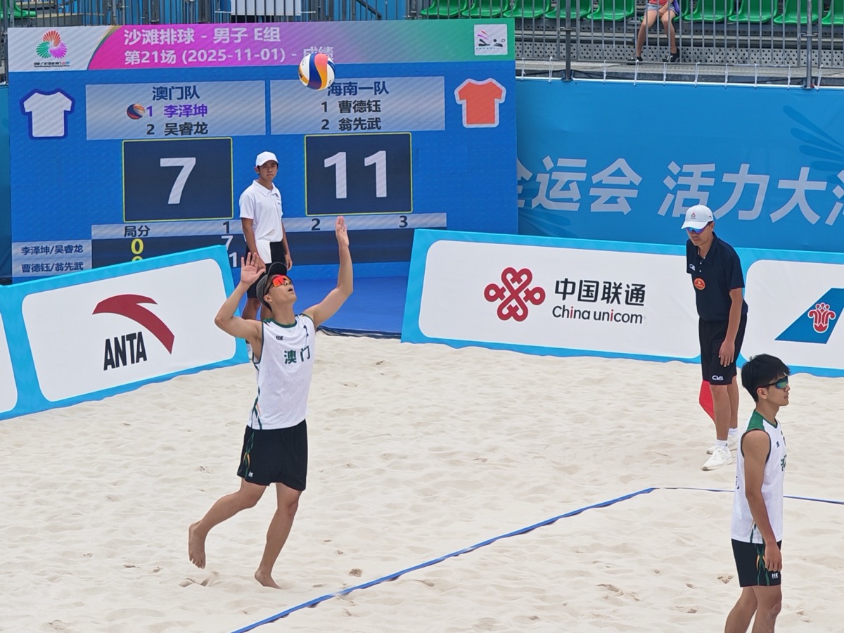 中華人民共和國第十五屆運動會沙灘排球項目,澳門男、女子沙排代表隊週六(1日)第二戰分別不敵海南一隊和香港一隊。