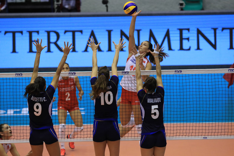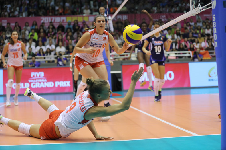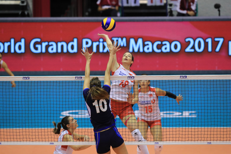 頭場意大利與土耳其之戰,贏波即可奪得澳門站冠軍的意大利,挾頭兩場的氣勢,開賽後一直處於領先優勢,一眾主力球員愈打愈放,反觀土耳其在進攻及防守上未構成威脅。意大利憑藉隊長基絲甸娜全場攻入14分,西拉及伊高奴亦分得交出13分及12分,最終協助球隊以25比13、25比20及25比14直落三局輕取土耳其,以三戰全勝姿態首奪澳門站冠軍。