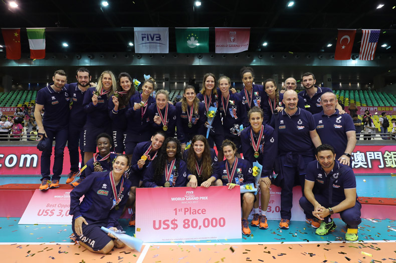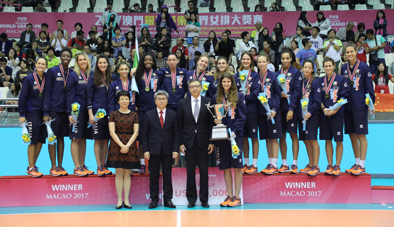 由國際排球聯會授權、體育局與中國澳門排球總會聯合主辦、銀河娛樂集團呈獻贊助的「2017澳門銀河娛樂世界女排大獎賽」今日(16日)於澳門綜藝館上演壓軸日賽事,意大利直落三局擊敗土耳其,三戰全勝奪冠,而國家隊則以局數3比2反勝美國,奪得亞軍,美國與土耳其位列第三、第四。