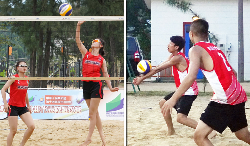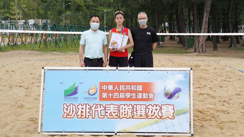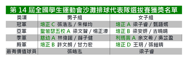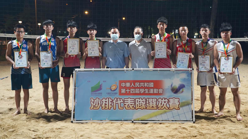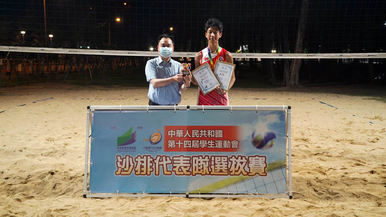 由教育及青年發展局主辦、中國澳門排球總會承辦的第14屆全國學生運動會沙灘排球代表隊選拔賽周六、日(8、9日)一連兩天在黑沙海灘沙灘排球場開打,男子組賽事,培正C和聖若瑟五校A的梁文智/楊正濠由小組賽起一路過關斬將,在決賽碰頭。首局開局培正C積極搶攻拉開比分,及後更越打越順擴大領先優勢,以21:5先下一城。第二局聖若瑟五校A加強發球反撲,雙方展開拉鋸戰;培正C中段雖取得領先,聖若瑟五校A並未放棄,局尾追平比分將比賽推向“刁時”,但培正C關鍵時刻再度發威連得兩分,22:20再取一局封王,張皓泓並獲選最有價值球員;聖若瑟五校A獲亞軍;慈幼A林偉諾/薛子健則擊敗培正B許文朗/甘力宏獲一席季軍。