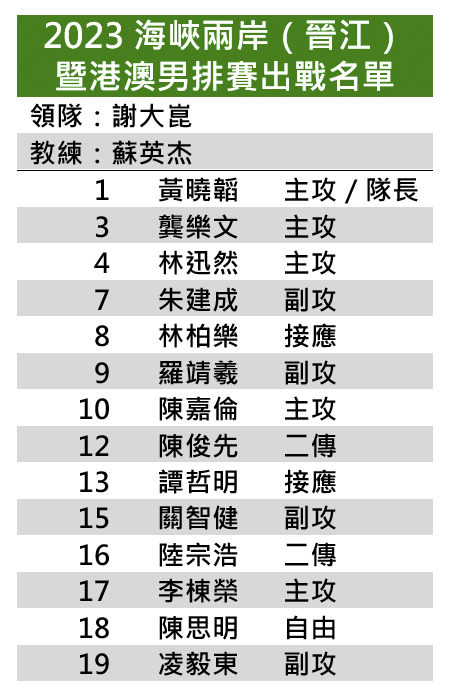 2023海峽兩岸(晉江)暨港澳男子排球比賽周五(12日)起一連三日於福建晉江開打,共有七隊參賽,首階段分成兩組進行小組單循環賽,每組首兩名晉級四強爭標。排總男子隊編排於B組,與香港南華、海南文昌和台南高工爭奪出線席位。