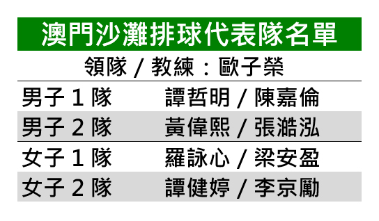 2023亞洲沙灘排球公開賽澎湖站將於周四(17日)起一連4天在澎湖隘門沙灘開打,男、女子組合共15個國家地區、47支隊隊參戰,澳門男子隊譚哲明/陳嘉倫、黃偉熙/張澔泓和女子隊羅詠心/梁安盈、譚健婷/李京勵攜手出擊,將與各地好手同場競技。教練歐子榮表示,杭州亞運在即,球隊接連出戰亞錦賽、國際排聯巡迴賽及即將舉行的亞洲公開賽,期望能持續改善自身不足、提升作戰能力,期待球隊在最好狀態下出戰亞運。