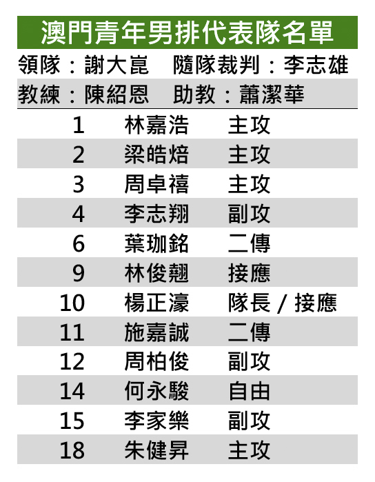 另一方面,澳門青年男排將出戰周三(16日)於蒙古烏蘭巴托揭幕的2023年東亞青年運動會,與東道主蒙古、國家隊、中華台北及中國香港對戰。澳門青年男排是次由接應楊正濠負起領軍重責,帶領主攻林嘉浩、梁皓焙、周卓禧、朱健昇、副攻黃李志翔、周柏俊、李家樂、接應林俊翹、二傳葉珈銘、施嘉誠和自由人何永駿等學界好手出戰。教練陳紹恩表示,球隊中不少球員是首次出戰區域性賽事,故已就是次比賽作針對性訓練,近期亦安排不同強度的練習賽備戰;期望球員能夠打出自身水平,爭取最佳成績,並從中汲取大賽經驗繼續成長。