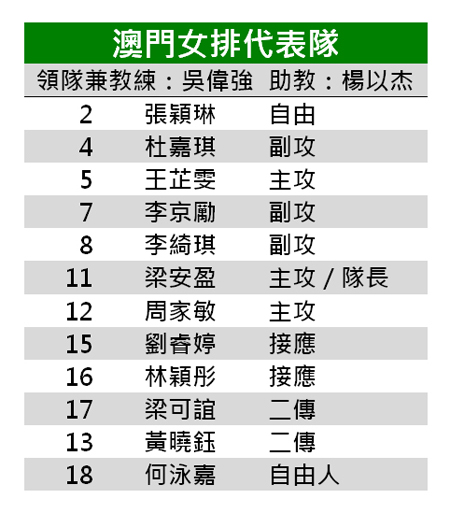 澳門女排是次由主攻隊長梁安盈續擔領軍重責,主攻周家敏、王芷雯、副攻李京勵、李綺琪和二傳梁可誼等主力戰亦再披戰袍上陣;球隊亦加入劉睿婷、林穎彤、杜嘉琪、張穎琳、何詠嘉、黃曉鈺等好手組軍。