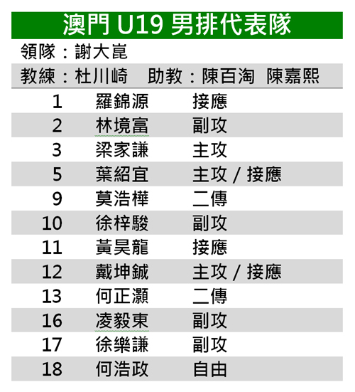 澳門U19男排由早前7月出戰巴林U20亞錦賽的接應羅錦源擔起隊長領軍重責,主攻梁家謙、副攻凌毅東亦繼續在陣中,再加上主攻葉紹宜、戴坤鋮、副攻徐梓駿、徐樂謙、林境富、接應黃昊龍、二傳莫浩樺、何正灝以及自由人何浩政等多名大學及學界好手組軍。