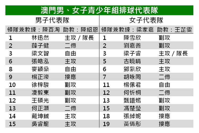 澳門青少年男排由主攻林迅然擔任隊長,與主攻戴坤鋮、副攻徐梓駿、凌毅東、二傳何正灝、自由人麥穎燊等多名甲組球員組軍;另外,去年底曾出戰全學運中學組賽事的主攻吳睿龍、副攻王碩光、二傳薛子健和自由人梁文智亦再披戰袍上陣;球隊並加入張皓泓、楊正濠等組軍。主教練陳百淘表示,由於對手身高基本在我隊之上,故近日訓練主要以針對高個子打法為主,以加強發球和攔防作為練習核心。陳百淘又指,參與國家水平賽事是難得經驗,期望球員能在比賽中發揮應有水平,展現個子不高但打法靈巧、防守充滿拼勁的精神,與各省精英周旋。