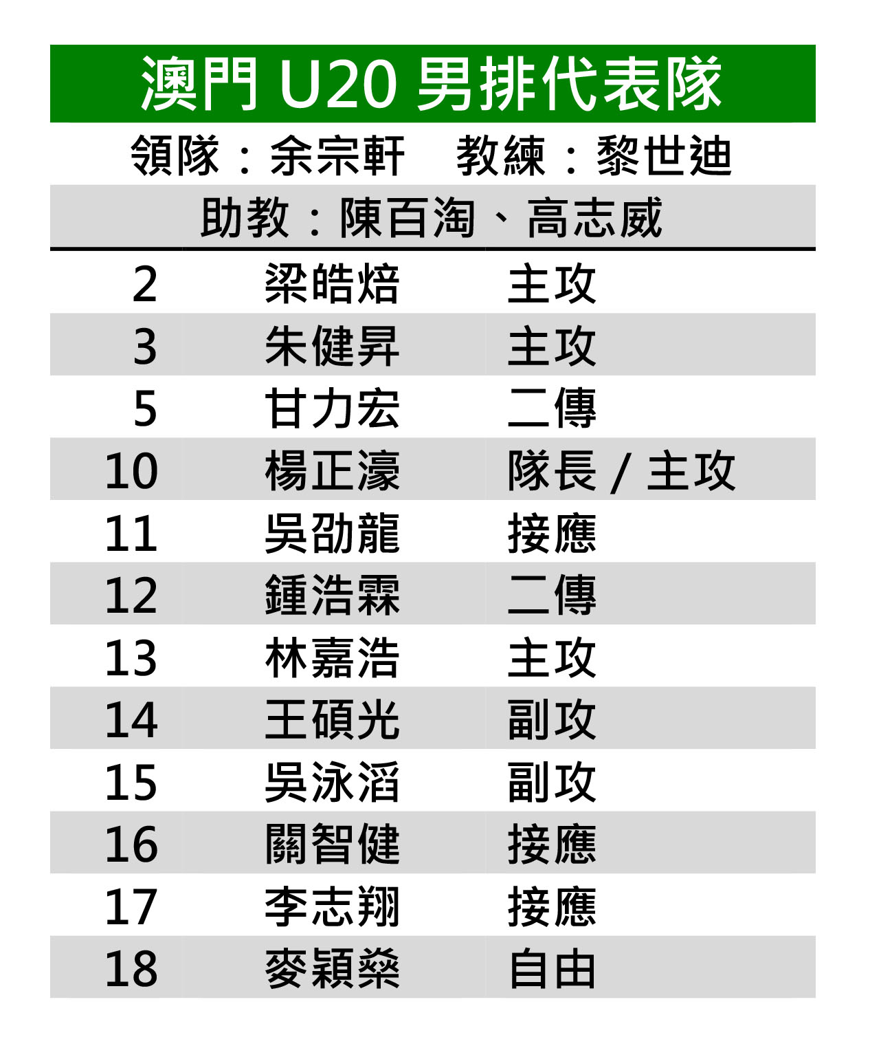 另外,U20男排代表隊亦於周三(29日)出發前往廣州,U20組別將於周六(11月1日)開打。