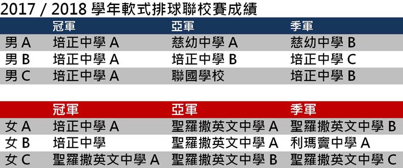 由教育暨青年局主辦、中國澳門排球總會承辦的軟式排球推廣計劃──軟式排球聯校賽進入第9屆,參賽學校及隊數逐年增加,今年賽事一共吸引了14間學校、共55支球隊參與。 賽事在4月21日、22日及29日於鮑思高體育中心進行,經合共136場賽事,男、女子各組三甲全部決出,當中,培正中學獲得男子A、B、C組及女子A、B組共五個組別的冠軍,成為賽事大贏家;聖羅撒英文中學獲得女C冠軍;至於慈幼中學、聯國學校和利瑪竇中學亦分別在不同組別中取得三甲席位。