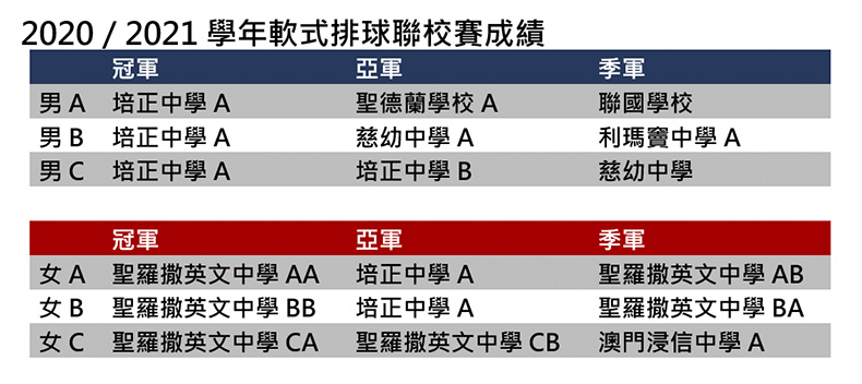 2020/2021學年軟式排球(迷你排球)推廣計劃—軟式排球聯校賽完成全部賽事,共吸引17所學校92支球隊參與競技,為小學階段學生提供更多接觸排球的機會。