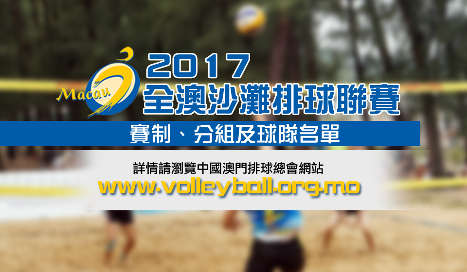 2017全澳沙灘排球聯賽已完成報名及抽籤分組,賽事共有47隊參賽,男子24隊、女子23隊。男、女子分別根據球隊積分高低分劃分甲組及乙組,各隊須於2017年5月2日、5月4-5日或5月8日按所屬組別至本會繳交費報名費,甲組每隊澳門幣250元正,乙組每隊150元正(如隊中有一名或以上的中小學生報名,即最可減免50元正)。