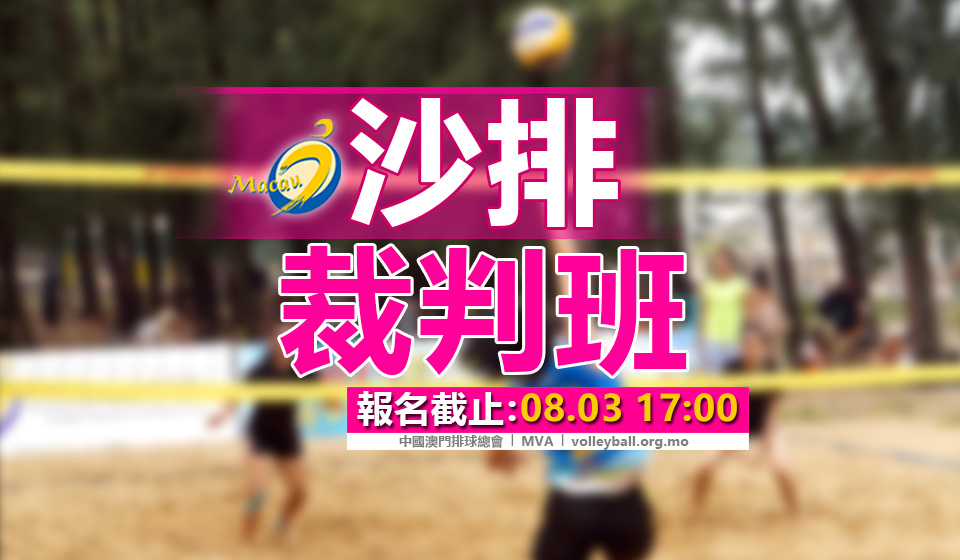 中國澳門排球總會主辦的2023沙灘排球規則暨初級裁判班課程將於8月6、6、12及19日舉行,並自即日起報名至8月3日17:00截止,課程名額20人,先報名先錄取,額滿即止,歡迎踴躍報名參與,章程及報名詳情請參閱本會網站。