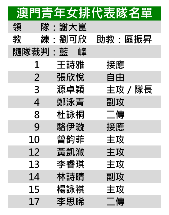 澳門青年女排由主攻源卓穎擔任隊長領軍,並由主攻曾韵菲、黃凱浟、李睿琪、楊詠祺、副攻鄭泳青、林詩晴、接應王詩雅、駱伊璇、二傳杜詠桐、李思晞和自由人張欣悅等一眾學界好手組軍。