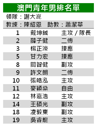 粵港澳大灣區男子排球錦標賽周二(28日)起一連七日開打,本澳派出男子青年隊參賽。球隊是次由主攻戴坤鋮擔任隊長領軍,並以多名曾出戰2021年第十四屆全國運動會青少年組賽事的球員為主要班底,主攻張皓泓、吳睿龍、副攻凌毅東、王碩光、接應楊正濠、二傳薛子健和自由人麥穎燊等皆在陣中;另外,亦加入甘力宏、關智健、許文朗和林嘉浩等學界好手。