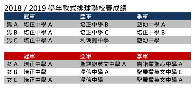 賽事在早前4月14日及28日於鮑思高體育中心進行,經合共165場賽事,男、女子各組三甲全部決出,當中,培正中學橫掃全部六組冠軍,並以六冠兩亞一季的成績成為賽事大贏家;聖羅撒英文中學獲女A亞軍及女B、C組季軍,浸信中學獲得女B及女C兩組亞軍,利瑪竇中學收獲男C亞軍,慈幼中學和嘉諾撒聖心中學亦分別在不同組別中取得三甲席位。
