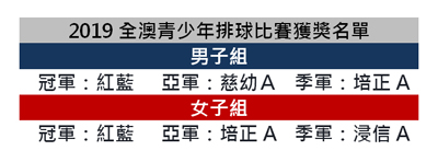 2019全澳青少年排球比賽圓滿結束,紅藍男、女子隊皆以全勝姿態包攬兩組冠軍,並攜手完成二連霸。