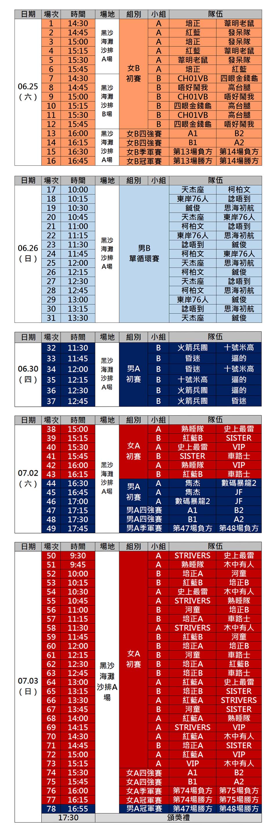 2016全澳青少年沙灘排球比賽已完成報名及抽籤,賽事共有33隊參賽,男子13隊、女子20隊。男、女子分別按年齡劃分為A組及B組。各組賽事已完成賽程編排(詳見上圖),各組賽事賽制、分組及球隊名單資料如下: