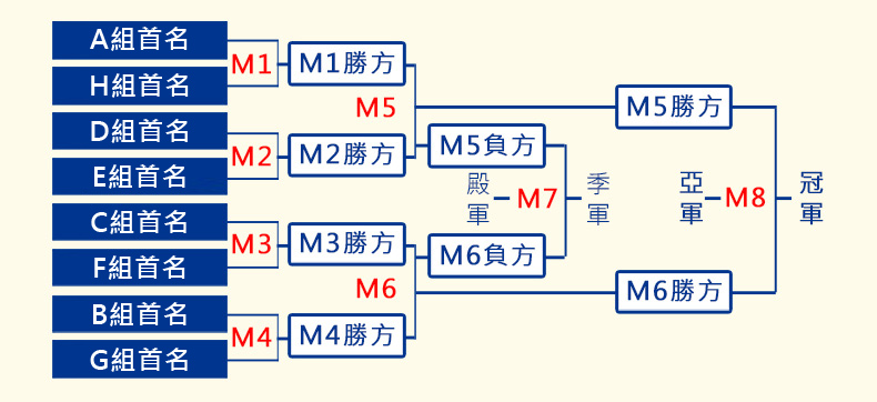 次階段八強賽事起採用單淘汰賽制,每場賽事1局15分定勝負。