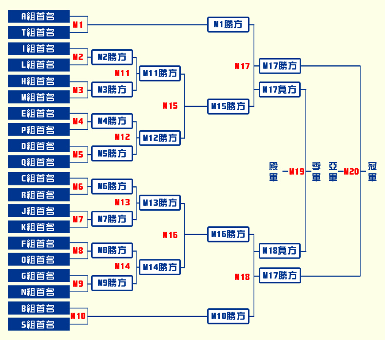 次階段二十強賽事起採用單淘汰賽制,每場賽事1局15分定勝負。
