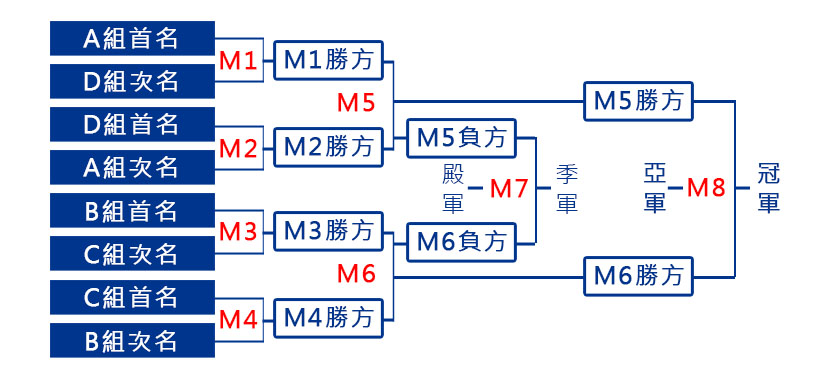 次階段賽事起採用單淘汰賽制。六強賽、四強賽及季軍戰1局15分決勝負;冠軍戰1局21分決勝負。