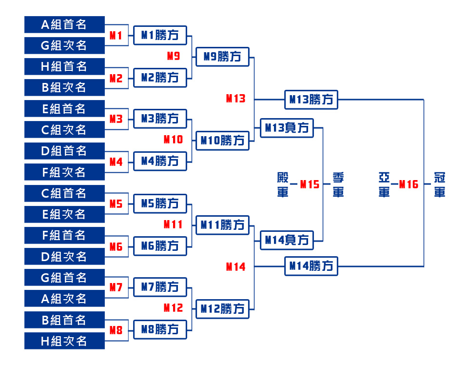 次階段16強賽事至冠軍戰採用單淘汰賽制,各場賽事1局15分定勝負。
